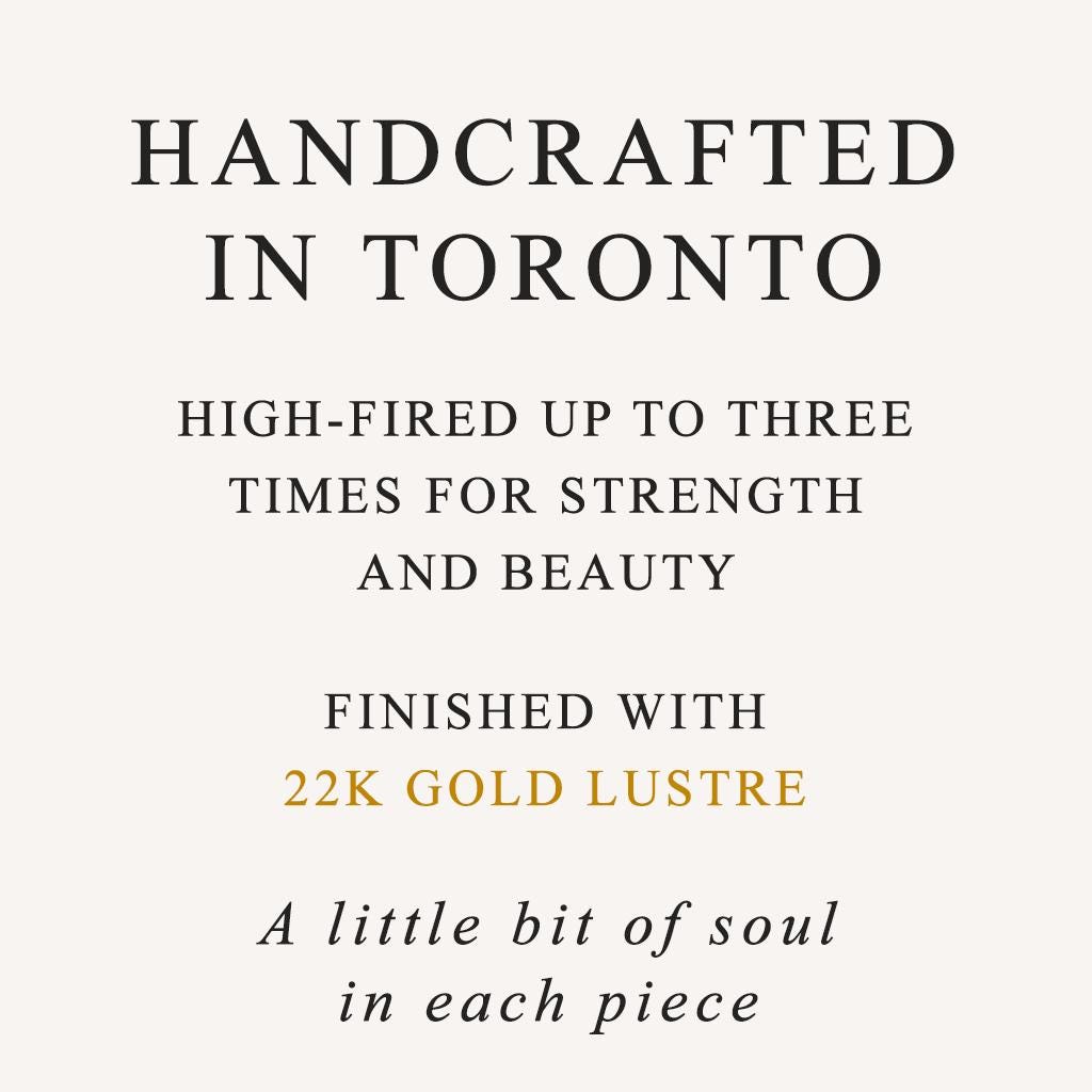 Each pair is individually shaped from porcelain and undergoes three separate firings — bisque, glaze, and gold lustre — a process that takes several days to achieve their strength, beauty, and lasting finish. Every set is unique, reflecting the care and craftsmanship in each step.