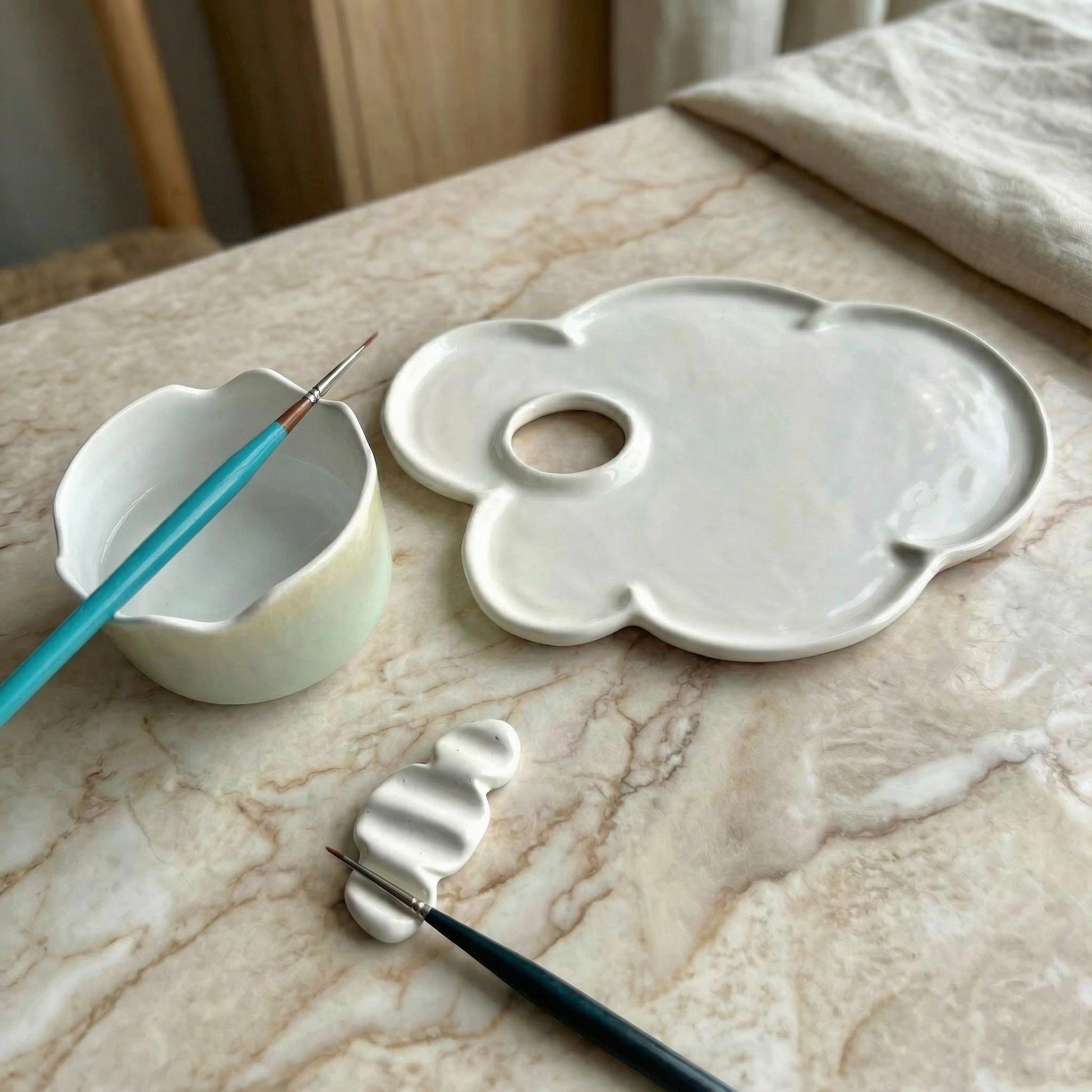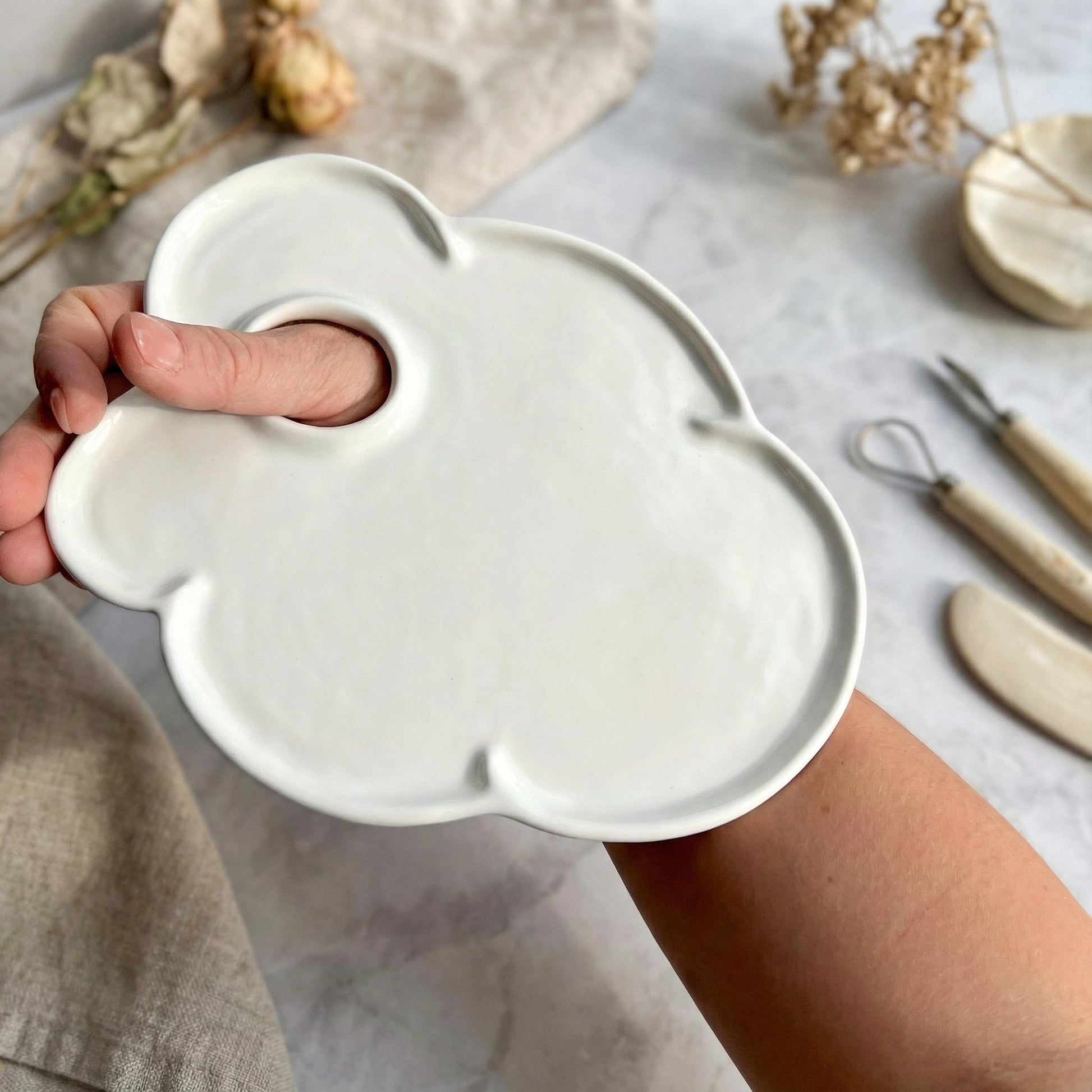 These ceramic paint palettes are compact, cloud-shaped tools designed for everyday painting and travel. Each piece is hand-built from porcelain using slab and coil techniques, then refined, kiln-fired, hand-signed, and finished in a soft white glaze.